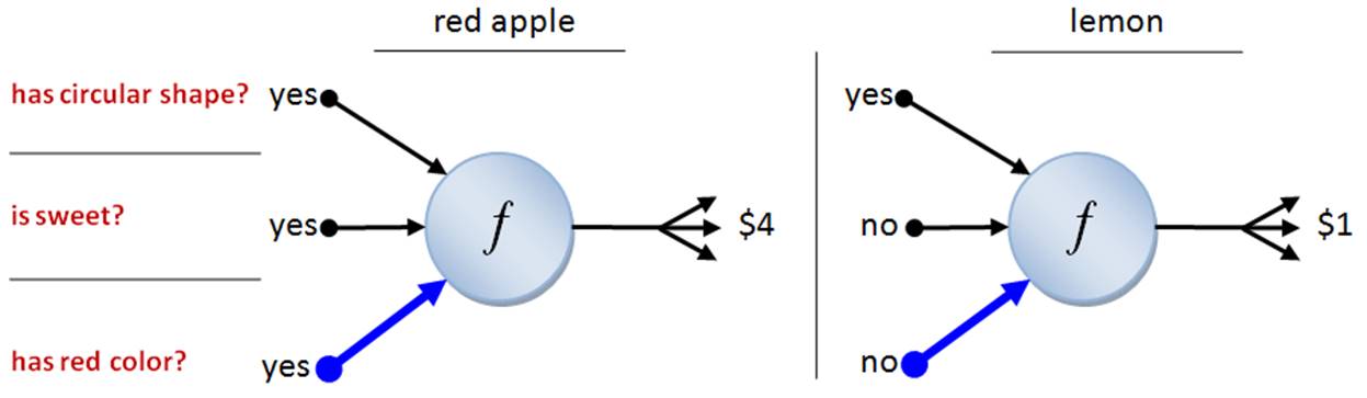 In an artificial neuron, some of the information can be more important than the others. For instance, to have red color may be more valuable in determining the price of produce. Assume that round shape and sweetness has equal value of $1; however, having red color is $2 – twice as valuable as the other features (Figure 5).