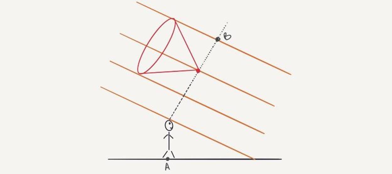 Let’s say you are standing at point A and the sunlight is coming from the left. Since the light comes from infinitely far away, all these lines are parallel to each other. Let’s say you look at the sky in direction B and pick a raindrop at any point. Any point you pick will cast the cone in the direction of the sun with the angle 60°.